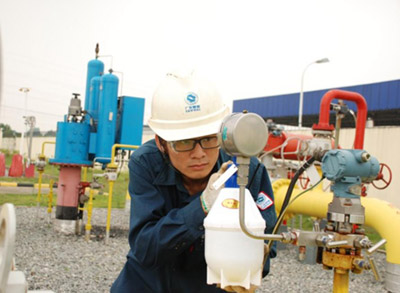 图为工作人员正对管道进行验漏。