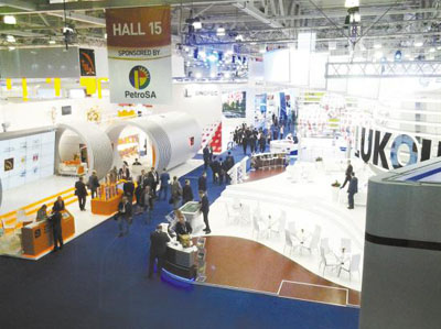 来自世界80多个国家的政府官员、公司高管和能源专家学者出席了本届大会,共有超过500家全球领先的石油、天然气生产运营商、供应商和服务提供商亮相同期展会。图为展会一角。