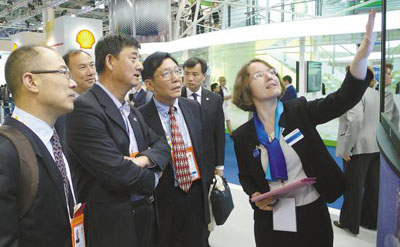 出席会议的世界石油理事会中国国家委员会代表参观展台,与外方专家进行深入交流。