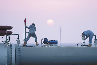 图为管道局投运公司工程师在米桑原油外输管道末端对原油进行流程确认。