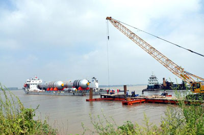 由于重量大、体积大,属于超限设备,给水上运输提出了较高的要求。为确保设备顺利运抵九江,9月7日,物流单位调用载重7000吨的甲板驳船从大连起航,船载5台设备,包括4台反应器、1台冷高压分离器,于9月13日航运至九江水域,9月20日抵达九江石化临时码头。这是该工程首批经由长江水路运抵的超重、超大型设备。