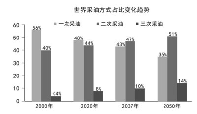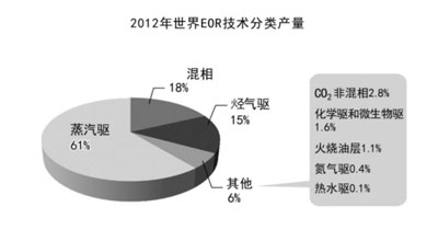 提高石油采收率(英文简称为EOR)是石油工业永恒的主题。从利用天然能量自喷生产开始,世界石油工业经过100多年的发展,现已形成化学驱、气驱、热采三大三次采油技术系列,同时,微生物驱提高采收率也取得一定进展。据统计,2012年,世界三次采油提高采收率技术总产量为9037万吨(不含中国)。从提高采收率技术分类上看,热力采油为第一大方法,产量占三次采油总产量的61%;气驱为第二大方法,产量占三次采油总产量的36%。在气驱产量中,二氧化碳混相驱产量占18%,烃气驱产量占15%;其他三次采油技术,包括二氧化碳非混相驱、化学驱、微生物驱、火烧油层、氮气驱、热水驱等仅占6%。由于全球温室气体减排相关政策的鼓励,在各种三次采油技术中,二氧化碳混相驱技术的应用增长最为快速。