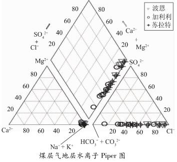 水中HCO-3、SO2-4、Cl-矿物质溶解度依次增大,随着地层埋深加大,这些离子也依次发生沉淀,因此一般情况下从浅往深,地层水类型也逐渐从HCO-3型向SO2-4型及Cl-型转变,水动力逐渐减弱。反过来也可以通过地层水类型判断水动力的强弱。从下图可以看出,波恩、苏拉特盆地煤层水类型为Cl-Na型,水动力弱,加利利盆地煤层水类型为HCO3-Cl-Na型,水动力强,与之前分析相吻合。