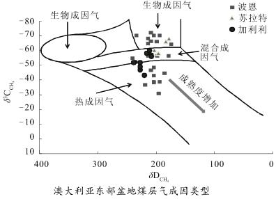 热成因气的甲烷碳同位素较重,一般大于-50‰,而次生生物作用使甲烷同位素变轻,一般认为小于-60‰,次生生物气与热成因气混合后,碳同位素值处于两者之间。因此可以根据煤层气甲烷碳同位素与甲烷的氢同位素分布特点判断煤层气成因类型,从表4煤层气甲烷碳同位素分布范围可以看出澳大利亚东部含煤盆地煤层气都有次生生物气作用。