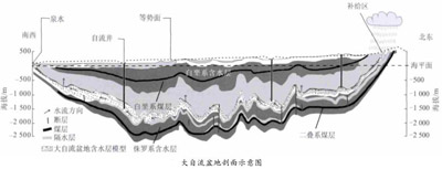 煤系中流动的地下水对煤层气的保存有很大影响,在平面上和剖面上,水动力条件强的地区,煤层气的含量小;相反,在水动力不活跃地区或滞留水区域,煤层气的含量则比较高。大自流盆地是澳大利亚最大的承压水盆地,昆士兰州东部含煤盆地煤系地层大都被大自流盆地(Great?Artesian?Basin)的含水层所覆盖,含水层包括了侏罗系—白垩系渗透性砂岩,与泥岩等致密性隔水层互层发育。大气降水通过昆士兰州东部露头补给区向西南方向渗流,地下水等势面海拔高于海平面(下图)。