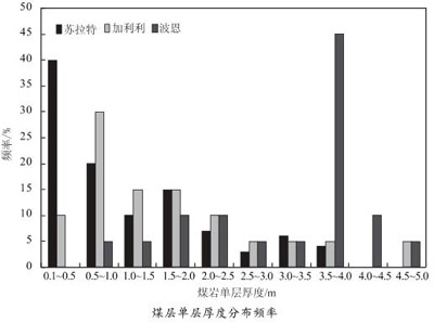 煤层单层厚度不仅影响煤层的生气量,也决定了煤层气的开发方式。波恩盆地煤层单层厚度较厚,盆地北部开发区,单层厚度1~9m,大多为3~4m(下图),累计厚度一般在15m左右,采取水平井加直井组合的开发方式;