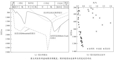 在不同的构造单元内,煤变质程度变化较大,从褐煤到无烟煤都有分布。盆地北部Blackwater-Moura煤层气开发区,大部分区域三叠系地层已被剥蚀,第三系地层直接覆盖在上二叠统RaNgal煤组之上,下覆的Moranbah煤组为主要煤层气勘探目标,现今埋深为200~1000m,镜质体反射率Ro为1.14%~2.78%(上图b)。