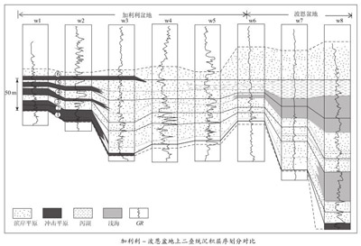 加利利盆地与波恩盆地Denison凹陷的上二叠统煤系地层是以2个区域不整合面为二级层序界面的沉积充填序列,并可以识别出6个三级层序(下图),其中加利利盆地总体以退积型沉积层序为主。