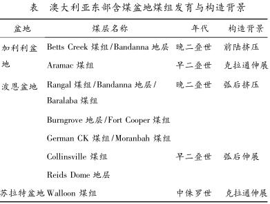 3)弧后前陆冲断期,晚二叠世—中三叠世在逆冲负载与热沉降双重沉降机制作用下,盆地沉积了巨厚的海陆过渡相-陆相地层。这一阶段是盆地煤系地层发育的鼎盛时期,主要发育与潮控三角洲相、河控三角洲相等相关的煤系组,从下往上发育的煤组有German?Creek煤组/moranbah煤组、Burngrove地层/Fort?Cooper煤组、Rangal煤组/Bandanna地层/Baralaba煤组(下表),其中Rangal煤组分布范围最广,几乎可以覆盖整个盆地。