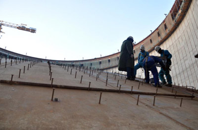图为四建员工正在进行LNG储罐罐顶气顶升前安装准备工作。曲照贵摄