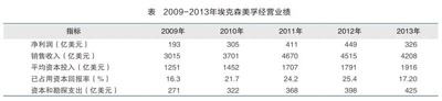 在美国,很多人愿意将自己的财产或者遗产以埃克森美孚股票的形式保存,足见其在民众心目中的地位。2013年,受宏观、微观等多种因素影响,埃克森美孚的经营业绩出现下滑,表现为在平均占用资本保持连续增长的条件下,经营利润、销售收入等财务总量经营指标呈现自2010年以来连续下降的态势(见下表)。