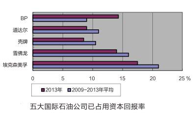 新近发布的BP公司2013年年报披露了其过去一年的经营业绩,数据显示,2013年BP公司的经营业绩有了颠覆性的变化。2013年之前,BP已动用资本投资回报率一直低于其他4家石油公司,但是2013年BP的这一指标走势出现跳跃式变化。公司年报数据显示,BP公司2013年的已动用资本投资回报率接近15%,在五大国际石油公司排名中仅次于埃克森美孚(见上图)。