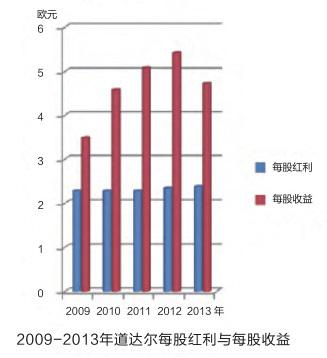 道达尔公司在其决策层发生调整的最近几年,营业收入整体上呈现持续稳定增长的态势,2012年营业收入达到2000亿欧元,当年的每股收益达到5.42欧元,但2013年出现一定程度的下降,较2012年的营业收入下降了105亿欧元(见下图)。公司在股票市场的表现并不尽如人意,2013年每股红利虽然基本保持不变,但每股收益降至4.7欧元,较2012年大幅下降(见下图)。