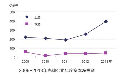 2004年后,随着油价的持续上扬,壳牌果断调整了发展战略,将目光瞄准世界油气潜力区,积极向深水油气、非常规油气等新领域进军。自2004年以来的10年,壳牌的投资项目特别是上游项目遍及全球各地,投资数额巨大,仅2013年的支出就达到443亿美元,较2012年增长了近50%;2013年上游净投资约为2009年的2倍(见下图)。