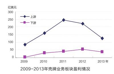 2013年,壳牌公司上游油气业务营业收入为929亿美元,下游营业收入为4044亿美元,其他方面的营业收入为1.5亿美元,合计4975亿美元。与2012年的5190亿美元相比,壳牌2013年的营业收入下降了4%,其中上游营业收入下降了2%,下游营业收入下降了5%。壳牌公司是一个注重上下游一体化的公司,其下游的相对规模大于上游。该公司的收入结构也体现出了这一特点,下游营业收入占公司收入的绝大多数。
