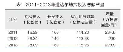自2012年起,道达尔在油气勘探业务领域推行了高风险高回报的经营战略,主要以偏远、高风险潜力区为目标展开勘探,期望获得巨大发现以实现其2015年260万桶油当量/日、2017年300万桶油当量/日的产量目标。根据道达尔公司年报,2013年道达尔用于勘探的投资高达28.09亿欧元。开发投入方面,2013年道达尔的总投入高达160亿欧元,较2012年的140亿欧元和2011年的100亿欧元有较大幅度增长(见下表)。