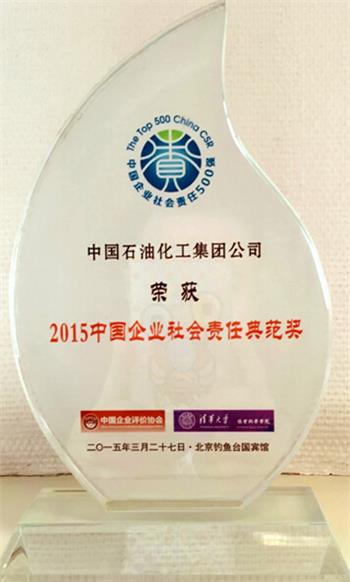 3月27日,“中国企业社会责任500强”榜单在京揭晓。中国石化从1600家候选企业中脱颖而出,以优异的社会责任表现进入该榜单前十,并荣获“2015中国企业社会责任典范奖”和“中国企业社会责任500强责任管理典型案例”。