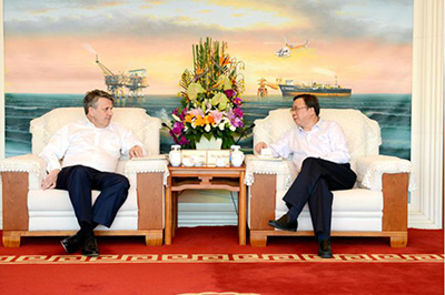 5月5日下午,总公司董事长杨华在北京中国海油大厦会见了来访的壳牌集团首席执行官范伯登一行,双方就进一步深化油气领域合作交换了意见。