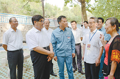 王玉普、戴厚良到齐鲁石化蜂山社区与社区居民交谈。记者章铮摄