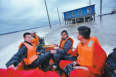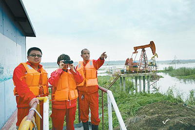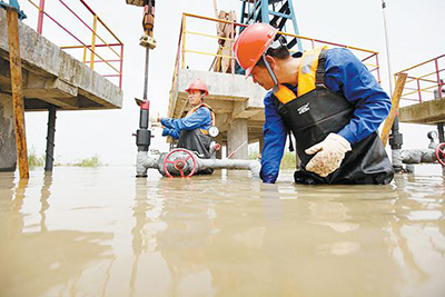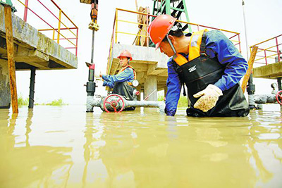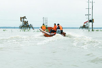 6月26日起,江苏洪泽湖三河闸连续6天向下游泄洪,江苏油田采油二厂384油水井处于泄洪道内,最大水深2.5米。
