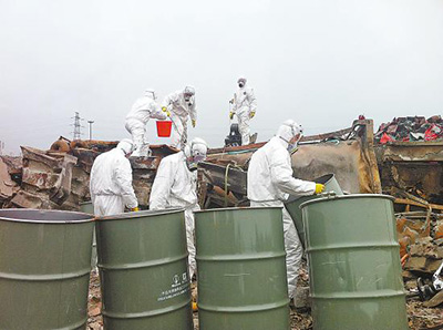 胆量的背后,是扎实的专业知识。经过专家仔细分析后,最终确定了3种处理方案:对少部分已炸开外露的,清理出一块场地,用过氧化氢或者其他办法进行化学中和来溶解。对大面积分散的,砌起一米多高的围墙围挡起来,为了防止因下雨造成的化学反应,还进行了必要的遮盖,预防二次污染。对成桶未损坏的将其及时清运,撤离现场,由专业化的公司进行专业化处置。