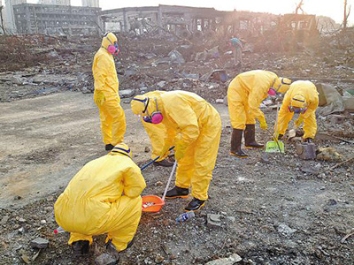 抚顺石化抢险队伍清理固体氰化钠。