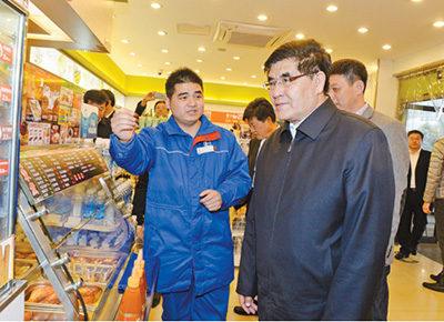 2月21日,王玉普一行在浙江石油杭州秋涛路加油站听取非油品业务介绍。记者胡庆明摄