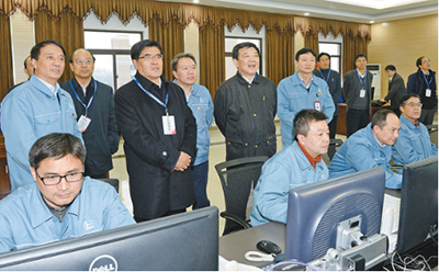 2月22日,王玉普一行在金陵石化生产指挥中心通过电子屏幕查看当天生产运行数据。