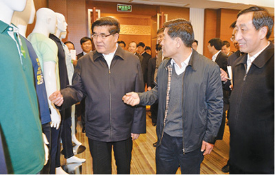 2月25日,王玉普在汇报会间隙,参观用仪征化纤原料生产的面料服装。