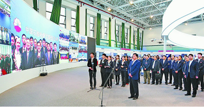 在信息化创新成果展厅,王宜林与集团公司海外企业员工进行连线交流,仔细了解这些企业的生产运行和信息化建设情况。