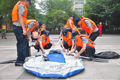 演练模拟近期自贡地区连降暴雨,釜溪河水位上涨、已临近警戒水位的情况。管理站在接到物业管理巡查员情况报告后,立即启动“防洪抢险应急预案”。应急演练有效检验了“防洪抢险应急预案”的可操作性,提高了员工队伍的整体应急处置能力。图为管理站人员为皮划艇快速充气。(通讯员舒小君张世云摄)