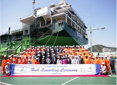 5月14日,国际公司尼日利亚公司OML130区块EGINA油田超大型FPSO(海上浮式生产储卸油装置)船体完工出坞仪式在韩国三星重工Geoje船厂举行。