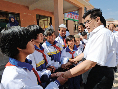 王玉普还参观了中国石化援建的布楞沟小学,看到学生在明亮的教室里认真学习,身着统一的中国石化捐献的校服,他十分高兴,给同学们送上新书包,勉励他们努力学习,长大后成为对社会、对人民有用的人。