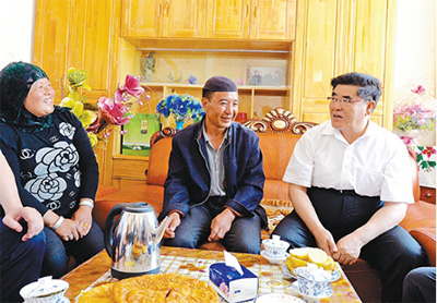 王玉普握着马外那西的手,询问他的家庭情况和生产生活情况。得知老马家的大儿子和大女儿只念到小学毕业,最小的儿子正读小学四年级,王玉普对老马说,过去读书条件不好,现在好了,要支持小儿子多读书,争取考上大学。