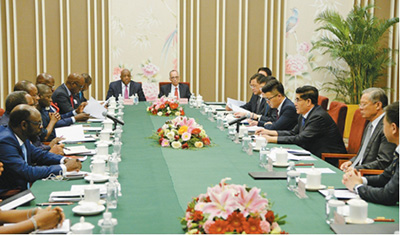 6月29日,中国石化集团公司董事长王玉普在京会见尼日利亚石油国务部长兼尼日利亚国家石油公司总经理卡希库一行,双方就业务合作与发展交换了意见,会见后签署了有关合作文件。王志刚、焦方正参加会见。记者程阳摄
