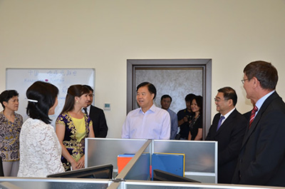 王宜林在中国石油哈萨克斯坦公司人力资源部办公室内与外方员工亲切交谈。