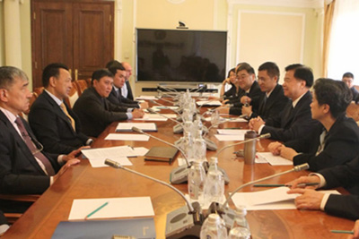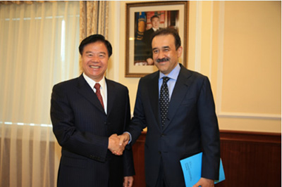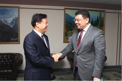 7月4日,王宜林与哈萨克斯坦国家石油天然公司总裁门巴耶夫会晤。记者孟庆璐摄