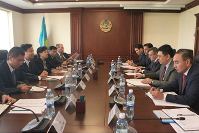 王宜林与哈能源部长博祖姆巴耶夫会晤。记者孟庆璐摄