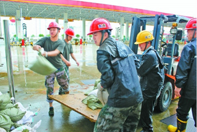 7月5日16时,长江武汉关水位达到27.58米,超警戒水位。西北销售公司武汉分公司迅速启动防汛应急预案,打响防汛攻坚战。图为武汉油库组织人员在油库公路发油区域装沙袋搭建围堰。刘杰摄