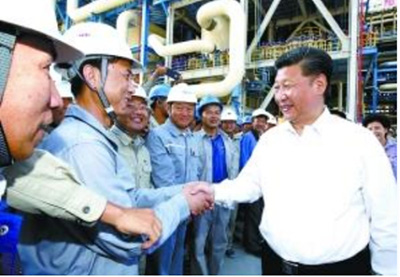 图为习近平总书记(右一)和煤制油一线工人亲切握手。(鞠鹏李涛摄)