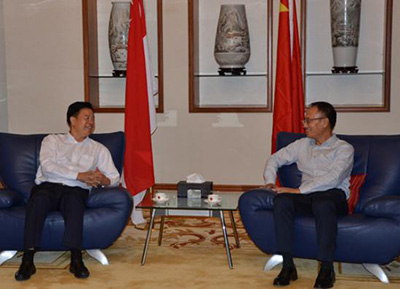 9月19日,王宜林与中国驻新加坡大使陈晓东进行工作交流。记者孟庆璐摄