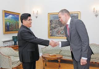 9月22日,正在冰岛访问的集团公司董事长王玉普在雷克雅未克拜会冰岛总统约翰内松,双方就深化地热资源开发利用合作交换意见。中国驻冰岛大使张卫东一同出席。