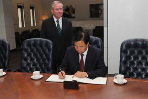 西澳大利亚州州长科林?巴奈特邀请王宜林在州政府贵宾访问留言册上签名留念。