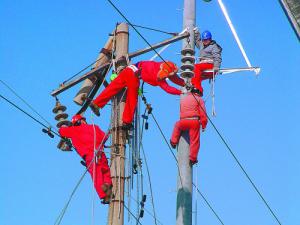 员工高空安全作业更换损坏的电线杆。