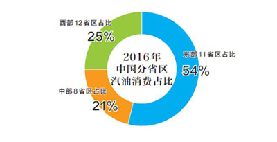 2016年,我国汽油消费增速由东部地区向西部地区梯次增加,西部地区增速最快,其次是中部,东部地区因限购限行和汽车销量放慢等因素影响增速垫底。从区域消费比重看,东部11省区汽油消费占全国比重超过一半,中部8省区占比为21%,西部12省区占比为25%。