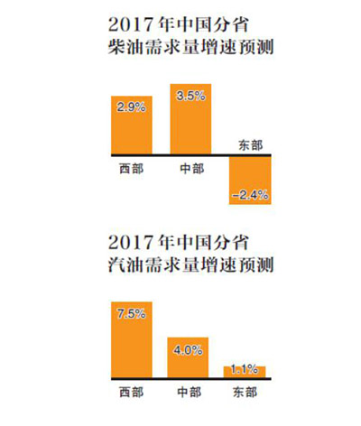 2017年,地区成品油需求增速各异,汽油由东向西梯次增大,柴油中部高东西部低
