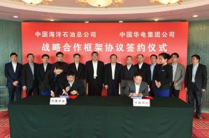 3月16日上午,中国海洋石油总公司(下称中国海油)与中国华电集团公司(下称中国华电)在京签署战略合作框架协议。双方表示,将在天然气贸易供销、技术交流等领域加强战略合作,共同促进我国能源产业转型升级和绿色发展。在中国海油董事长、党组书记杨华,总经理、党组副书记刘健和中国华电董事长、党组书记赵建国,总经理、党组副书记温枢刚的见证下,中国海油副总经理、党组成员李辉和中国华电副总经理、党组成员邓建玲代表双方在协议书上签字。