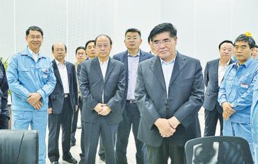 王玉普、戴厚良、李勇在石炼听取专业技术人员讲解企业火灾报警消防联动系统。张伟 姜军林 摄影 报道