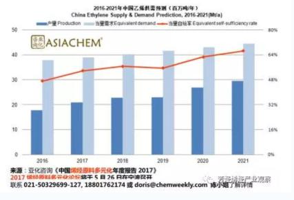 在新一轮以民营化工企业为主掀起的乙烷裂解制乙烯项目投资热潮的当儿,企业也因利润等驱动而大举布局实施煤化工和传统石化烯烃项目。亚化咨询预计,到2021年中国乙烯产能将达到3700万吨,较2016年增长87%,乙烯当量需求达到4400万吨左右,当量缺口约为1500万吨,乙烯自给率将从目前的47%提升到66%左右,届时乙烯市场依然存在巨大的缺口。