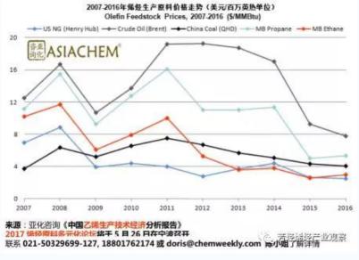 亚化咨询统计显示,目前中国包括已经布局和正在开展前期论证的乙烷裂解制乙烯项目达十多个,乙烯能力多在65万吨和百万吨级。根据项目进展和规划,将有2-3个乙烷裂解制乙烯项目在2020年之前投产。部分项目计划采购国内炼厂副产乙烷/丙烷资源,同时采购进口美国乙烷的方式,实现原料来源的多元化。随着拟在建项目的落成,继煤/甲醇制烯烃之后,中国的乙烯市场格局迎来了又一场巨震。